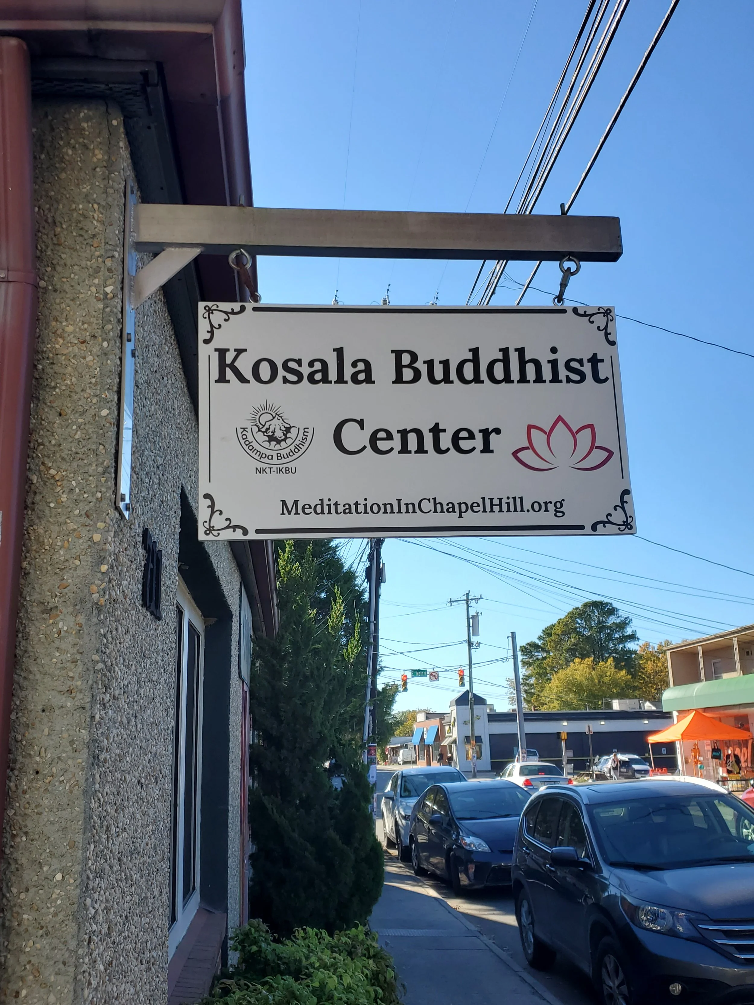 Also, the first three levels of the parking deck attached to the Hampton Inn across Franklin Street from the Center are free community parking. The hotel guests park on the upper two levels. The easiest way to park in the hotel deck is to drive in next to Back Alley Bikes (formerly Nice Price Books) from Franklin Street, and park in the first level (for some reason the basement is off limits — I believe this is employee parking). Then go along the walkway along that side of the hotel, cross the street in front of 401 Main, and go back down Rosemary Street half a block. Then walk to the entrance to the Carrburritos building (on the side where their parking lot is), then up the stairs to the Kosala Center. This really doesn’t take that long to walk, only about 3 minutes.